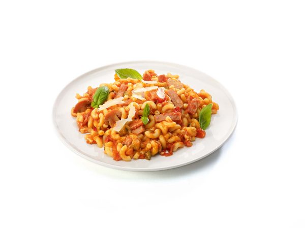 Italiaanse macaroni in tomatensaus met ham en kaas